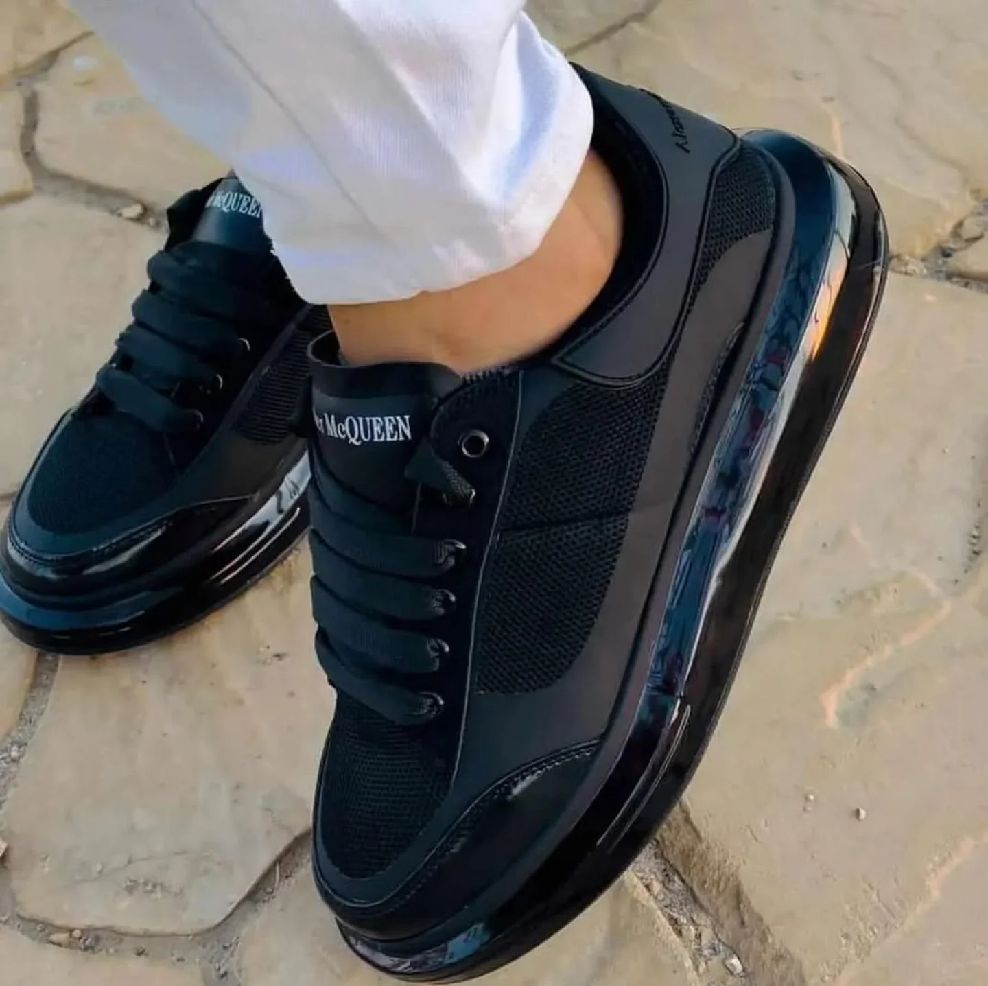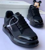 Step up your style with these all-black Alexander McQueen sneakers. Featuring a sleek silhouette, a chunky, glossy oversized sole, and a mix of materials for a modern texture, these sneakers offer a bold yet versatile look that’s instantly recognizable.