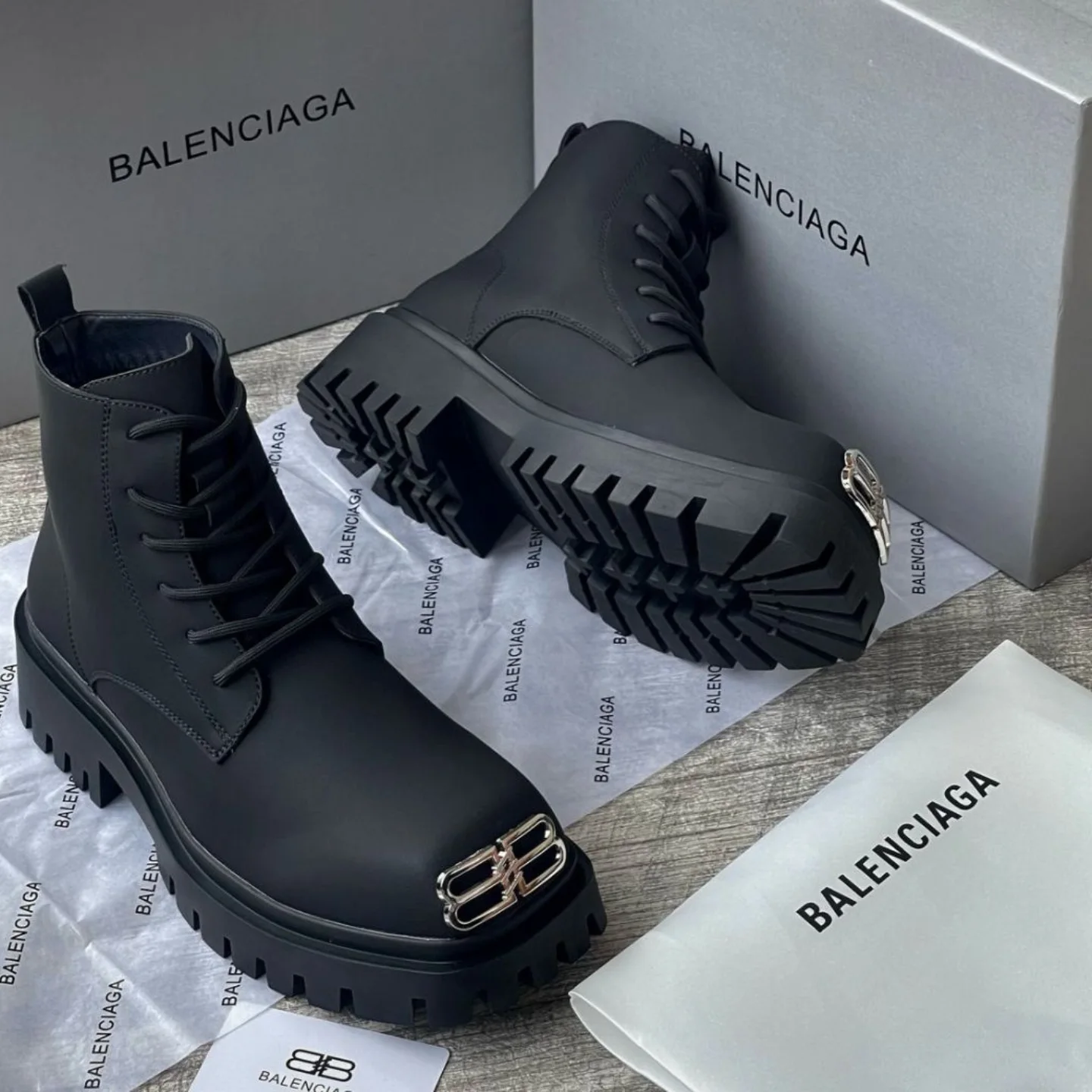 These combat boots feature a chunky sole, a lace-up front, and the iconic silver Balenciaga ‘BB’ logo hardware. Perfect for a bold, statement look.