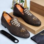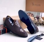 Handcrafted in Italy by Billionaire Italian Couture, these loafers embody the pinnacle of luxury and craftsmanship. The deep brown leather is embossed with a realistic alligator skin texture, giving the shoes a rich and exotic appeal. A discreet yet elegant gold-tone logo is meticulously placed on the vamp, signifying the brand’s commitment to high-end design. The contrasting dark leather sole, adorned with the brand’s logo, provides a sturdy and comfortable foundation. Designed for the discerning individual, these loafers are the perfect addition to a sophisticated wardrobe, whether for a formal event or an upscale casual gathering.