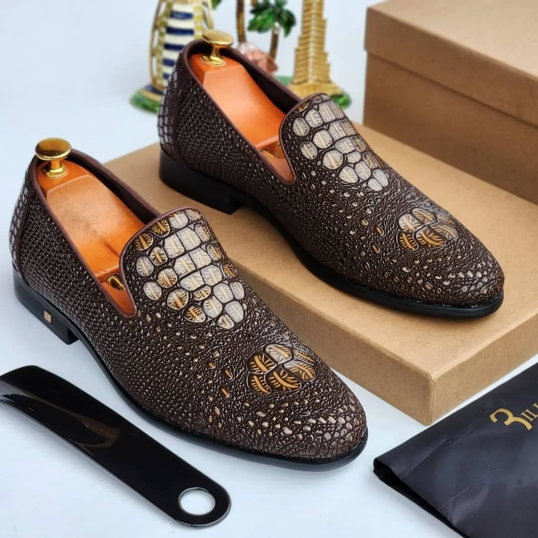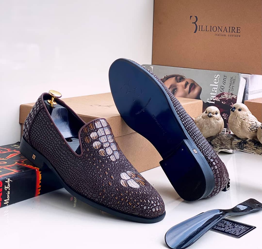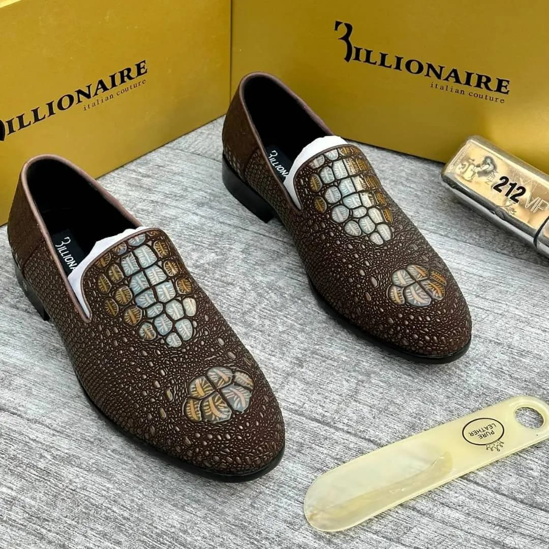 Experience ultimate luxury with these Billionaire Italian Couture loafers. Featuring an exquisite alligator skin texture and a sophisticated gold logo on the vamp, these shoes are a true statement of refined style.