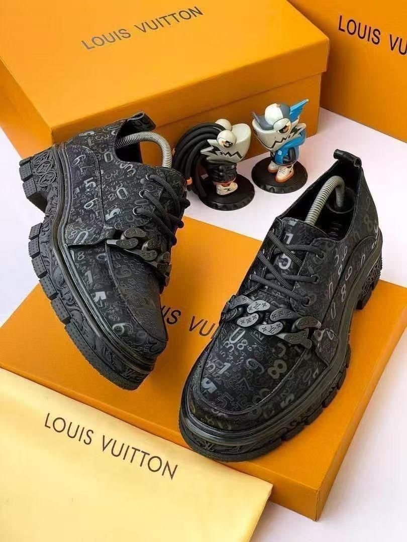 Unique Derby shoe with a Black Monogram/Numbers Print pattern across the entire leather upper and sole. Features small silver hardware charms on the laces and a chunky, heavily structured lug sole with LV motifs.