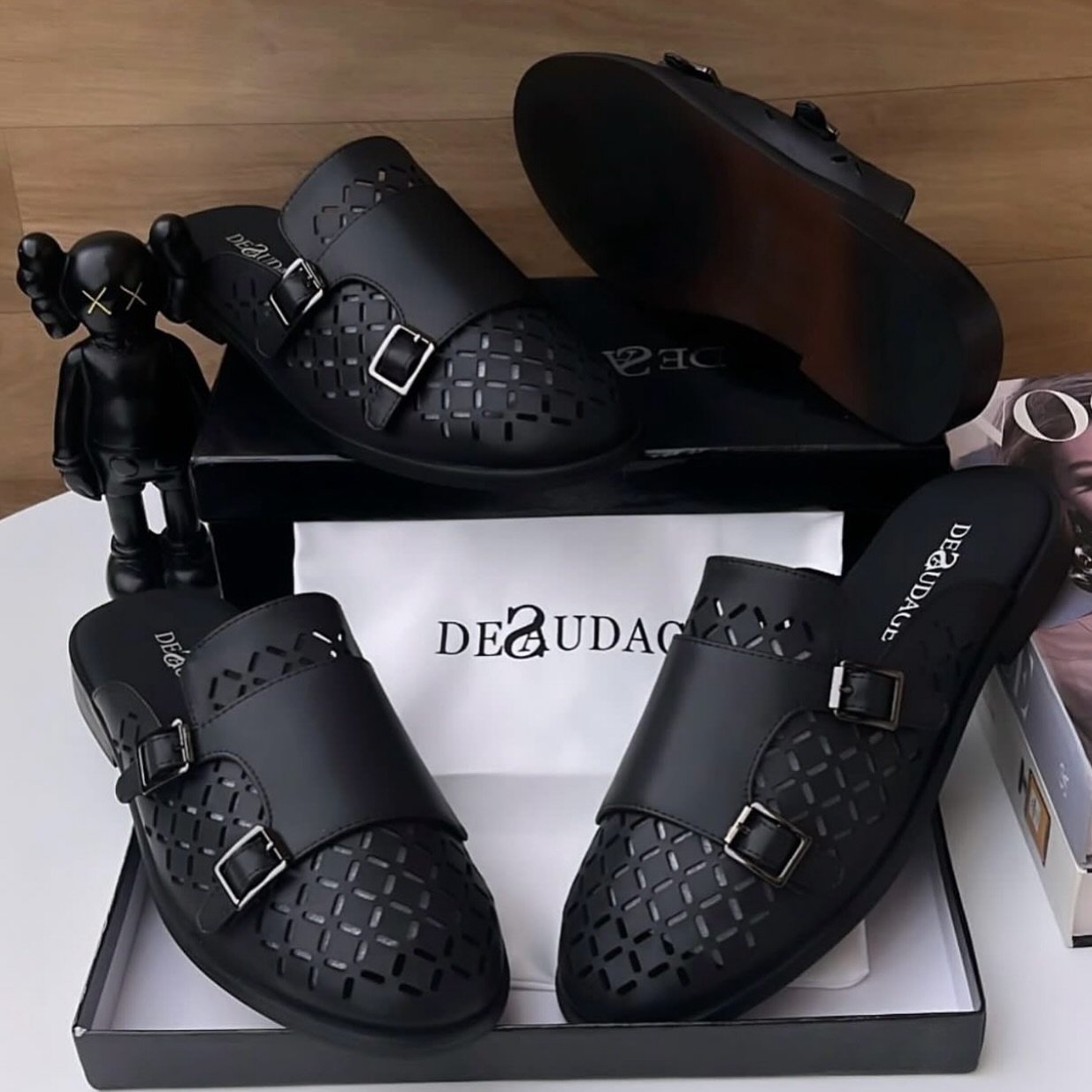 A modern fusion of comfort and style, these black slip-on mules feature a sleek perforated design and two adjustable buckles, offering an edgy and breathable choice for any warm-weather look.