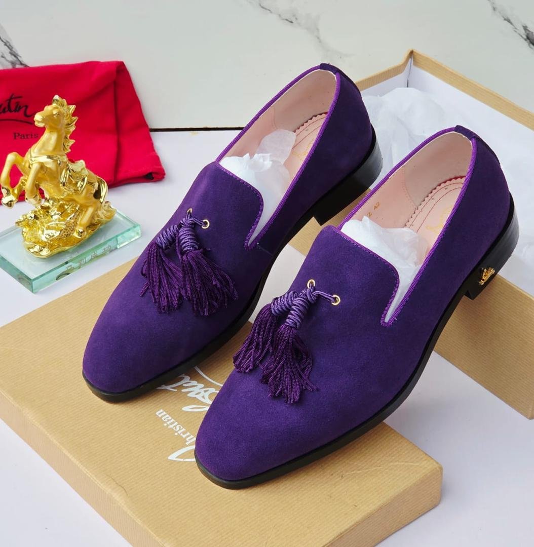 Elevate your footwear collection with the Christian Louboutin Dandelion Tassel loafers, a Venetian-cut silhouette that recalls the comfort of home slippers with the refinement of city shoes. This pair is rendered in a vibrant purple calf suede, providing a soft texture and luxurious depth.Iconic Details: Features the legendary red lacquered outsole, a global symbol of prestige and luxury status.Classic Finish: Detailed with tonal grosgrain piping and a matching suede tassel for a polished, seamless look.Versatile Style: The slender line and slip-on design make these the perfect choice for both formal events and smart-casual settings.