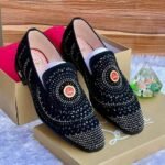 Experience unparalleled luxury and craftsmanship with these exquisite Christian Louboutin Dandelion Spikes loafers. Meticulously crafted from supple black suede, these shoes are a testament to refined style. The upper is lavishly embellished with an array of silver-tone studs, creating a captivating and dynamic pattern that catches the light with every step. The signature Christian Louboutin logo is prominently featured on a central medallion, while the iconic red lacquered sole adds a flash of undeniable prestige and confidence. Perfect for formal events, evening outings, or adding a touch of bold elegance to your everyday attire, these loafers are a must-have for the discerning individual who values both impeccable design and a daring edge.