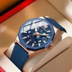 A bold and unconventional timepiece designed for a man who stands out from the crowd. This watch features a unique multi-faceted black case and an intricately designed skeleton-style dial that reveals the inner mechanics. The vibrant orange strap provides a striking color contrast, making it a modern statement piece that blends industrial style with casual fashion.