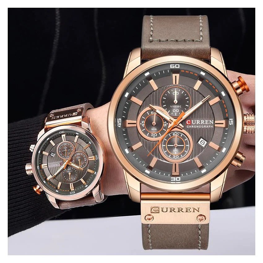 Color: The watch features a rose-gold case and a brown dial with matching sub-dials. The watchband appears to be brown leather.