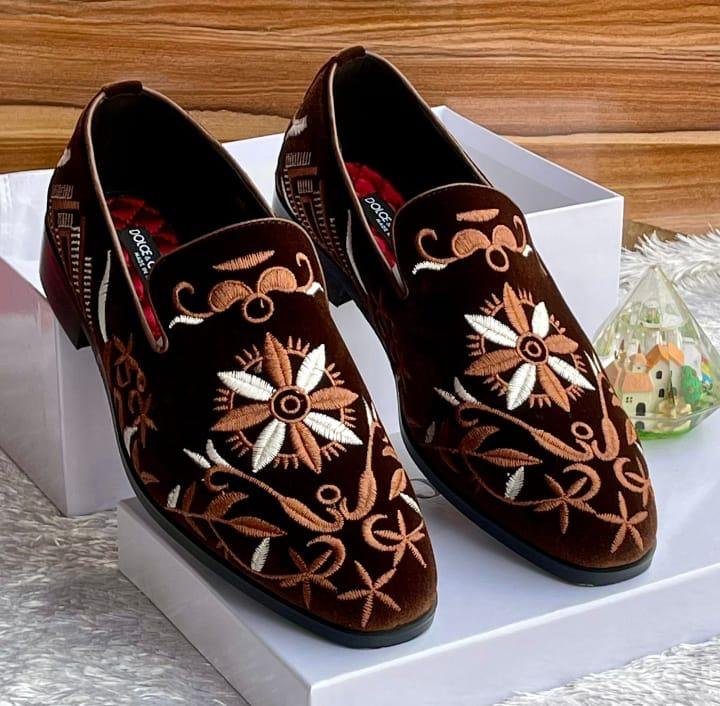 Step into pure Italian luxury with these statement-making loafers from Dolce & Gabbana. Crafted from plush brown velvet, these slippers feature intricate, multi-tonal floral embroidery that showcases the brand’s signature maximalist aesthetic. Designed with a refined almond toe and finished with a premium leather sole, they are the ultimate choice for black-tie events or elevating a tailored evening look.