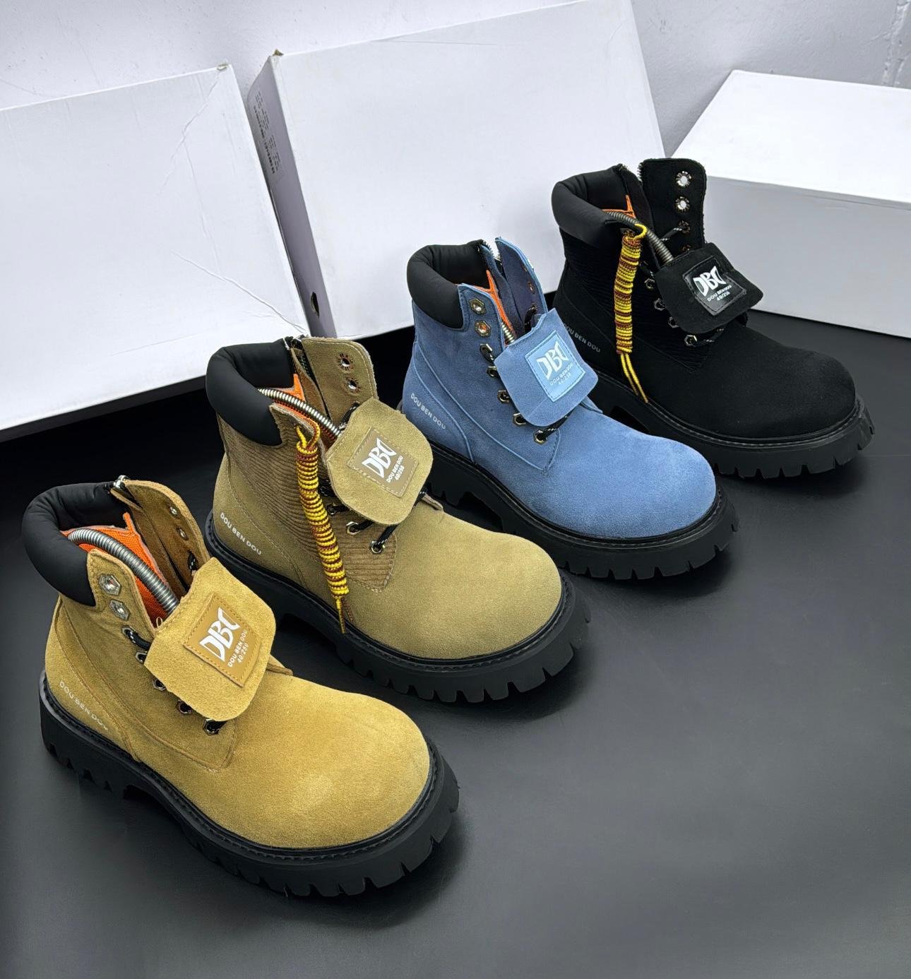 Discover the rugged style of Dou Ben Dou with these versatile boots. Featuring a durable design, a comfortable padded collar, and a convenient side zipper, these boots are perfect for anyone seeking a blend of urban fashion and practical functionality .Step up your street style with the Dou Ben Dou (DBC) boot collection. Crafted for both durability and comfort, these boots feature a robust black lug sole and a soft, padded ankle collar for all-day wear. The classic lace-up front is complemented by a functional side zipper, allowing for quick and easy on-and-off. A unique, textured tag with the distinctive “DBC” logo adds a touch of signature detail. Available in a range of colors including a classic tan, a bold blue, and a sleek black, these boots are designed to complement any outfit while providing the sturdy support you need for your daily adventures.