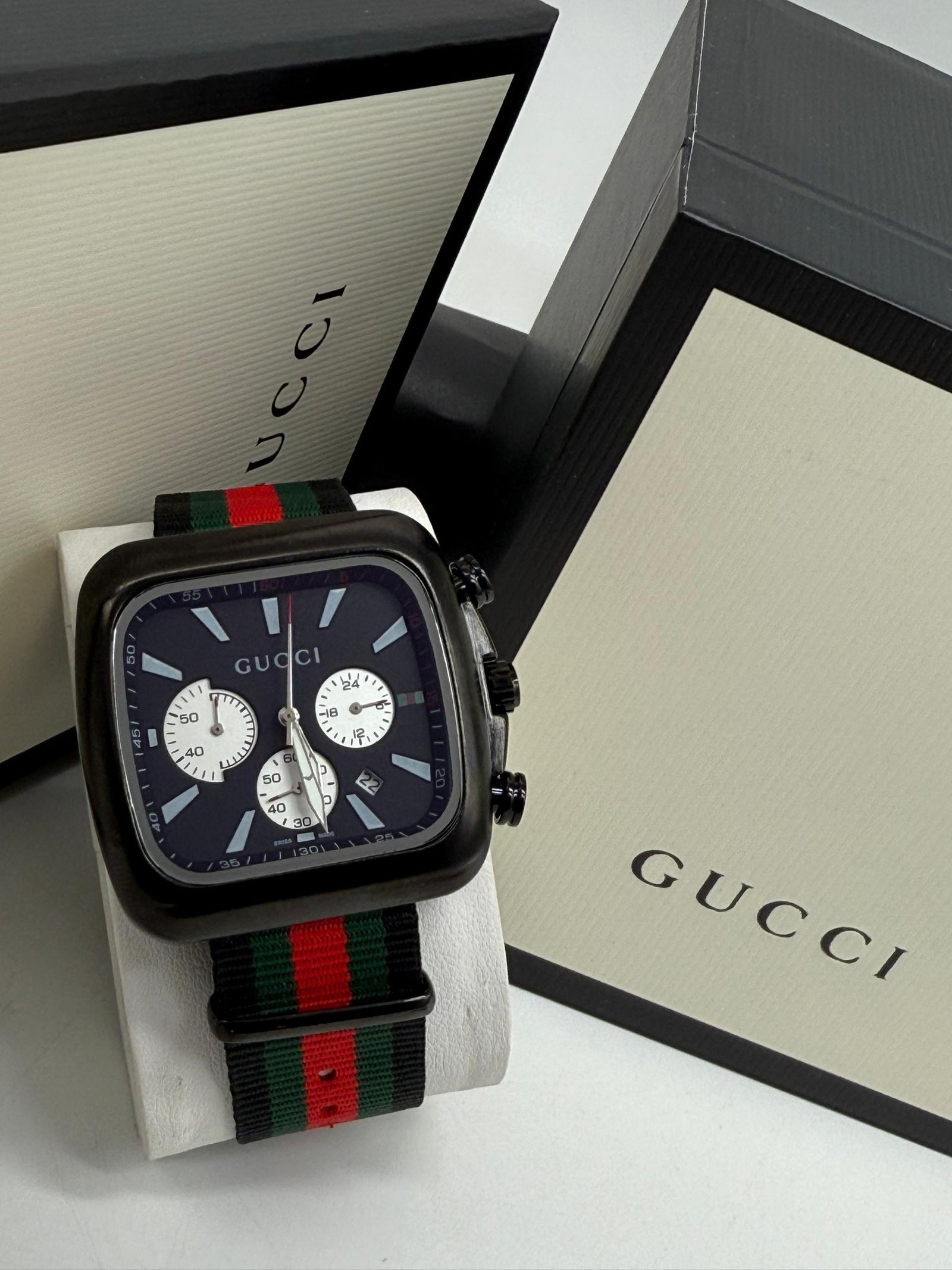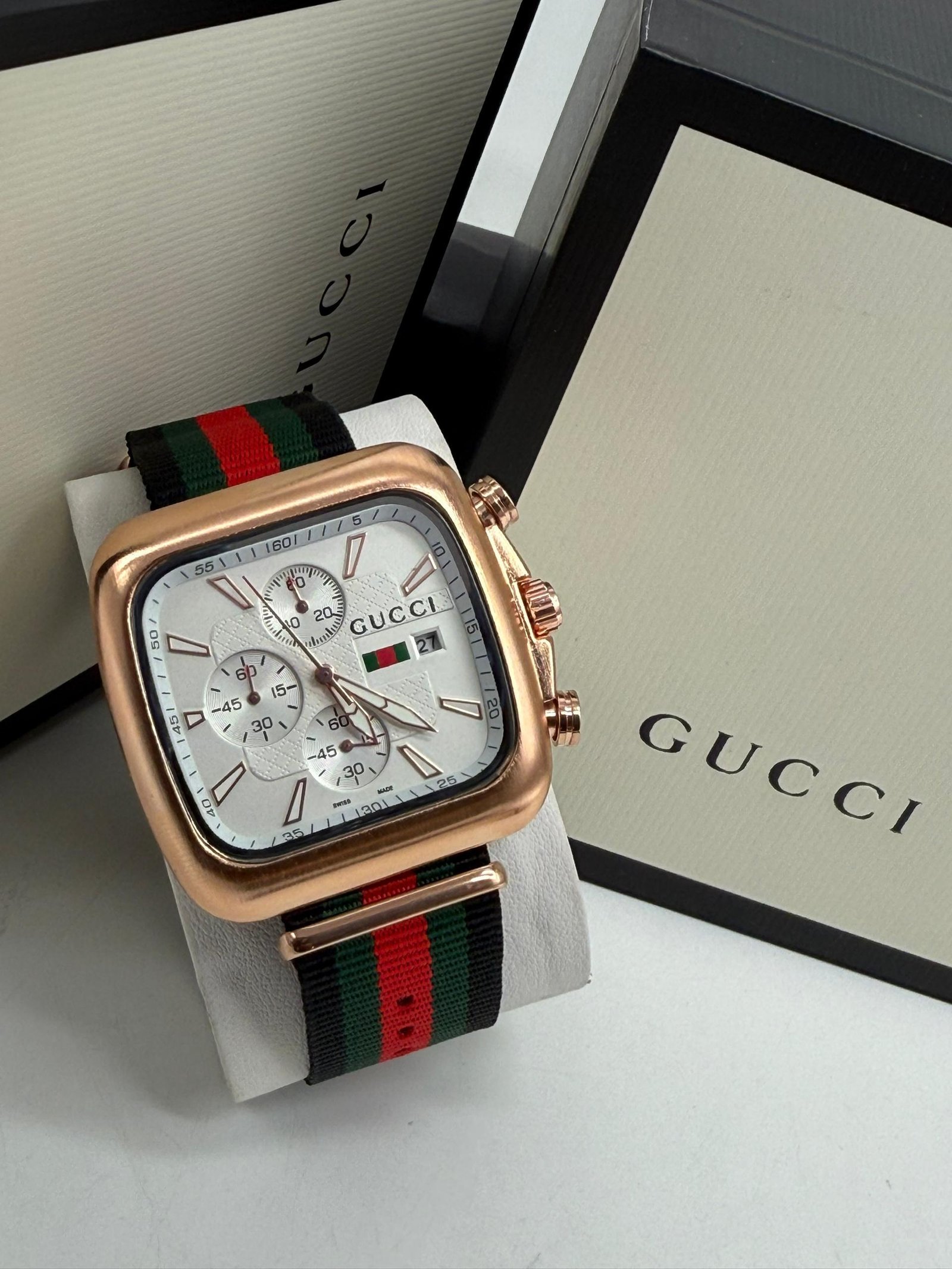 Make a bold fashion statement with this Inspired Gucci Chronograph Watch. This watch perfectly captures the iconic style of the renowned fashion house, featuring a sporty and sophisticated design that is both eye-catching and versatile. The square, rose-gold-tone case and the signature green and red striped nylon strap create a distinct look that is instantly recognizable.