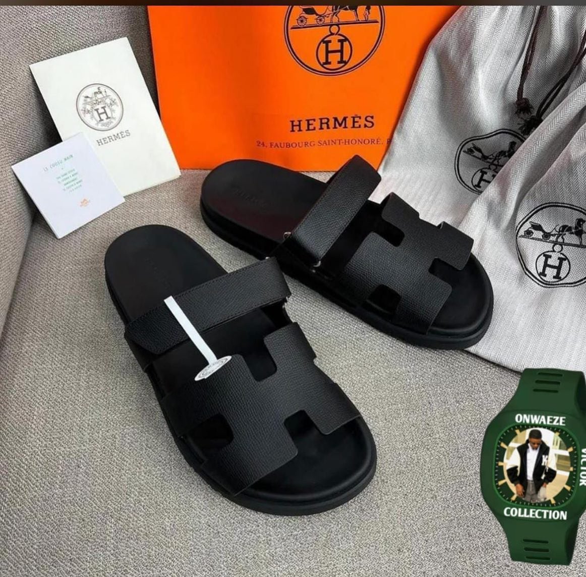Style: Men’s anatomical/sport-luxury slide sandal.Features: The sandal features a wide fixed strap over the toes shaped like the iconic “H,” and a second adjustable strap (often leather or neoprene-lined) near the ankle with a hook-and-loop (velcro) closure. It has a thick, anatomical rubber sole for comfort.Aesthetic: Functional, comfortable, and highly popular sport-chic model.Packaging: Signature Hermès orange box and branded dust bag.