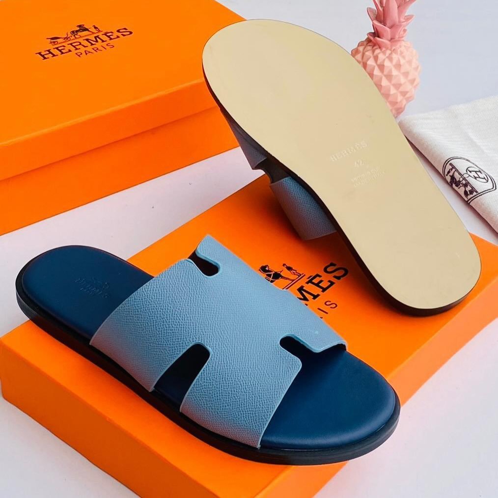 Key Features:Modern Architectural Upper: Features a bold, wide “H” cut-out strap that provides superior foot coverage while maintaining an airy, open feel.Tonal Minimalist Aesthetic: The cool matte grey leather upper and footbed create a monochromatic look that is both understated and high-impact.Premium Construction: Crafted with high-quality leather and a durable black rubberized sole for enhanced grip and longevity.Subtle Branding: Includes an embossed logo on the footbed, ensuring a touch of elegance that doesn’t overwhelm the minimalist design.Signature Presentation: These sandals come accompanied by a classic orange luxury box and a branded dust bag for protection and style.