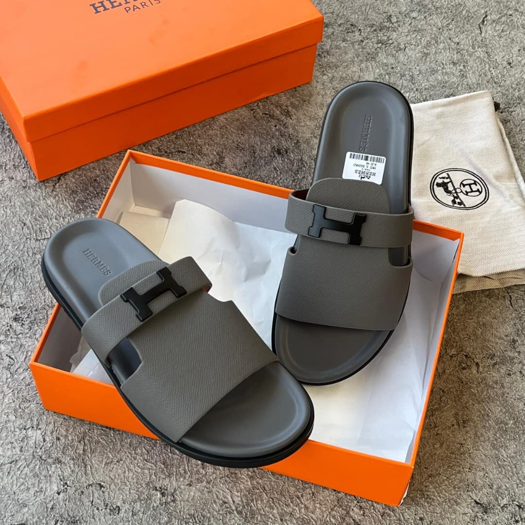 Elevate your leisure wardrobe with the Hermès Chypre Sandals. This modern iteration of the classic slide features textured graphite leather and the iconic “H” strap silhouette. Designed with a comfortable anatomical footbed and a sleek matte black buckle, these sandals offer a sophisticated, minimalist aesthetic for the discerning gentleman.