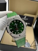 Experience the “Art of Fusion” with the Hublot Big Bang One Click Mint Green Diamonds. This 33mm masterpiece combines a vibrant mint green ceramic case with a dazzling bezel set with 36 brilliant-cut diamonds. Powered by an automatic manufacture movement and featuring a signature “One Click” quick-change strap system, it is the ultimate statement of feminine elegance and modern innovation.