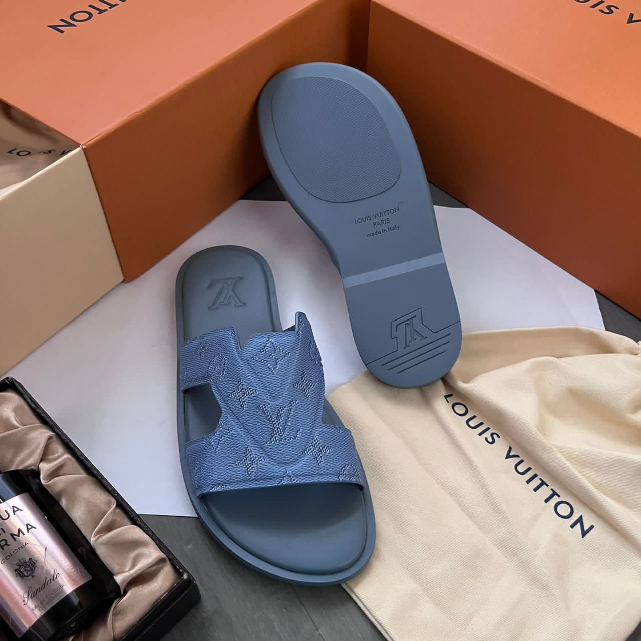 Step into effortless luxury with these Louis Vuitton Monogram sandals. Featuring a tonal, all-over embossed LV Monogram on a supple grained leather upper, these mules are finished in a sophisticated Denim Blue. With a comfortable contoured footbed and a durable rubber outsole, they are the ultimate statement piece for elevated leisure.