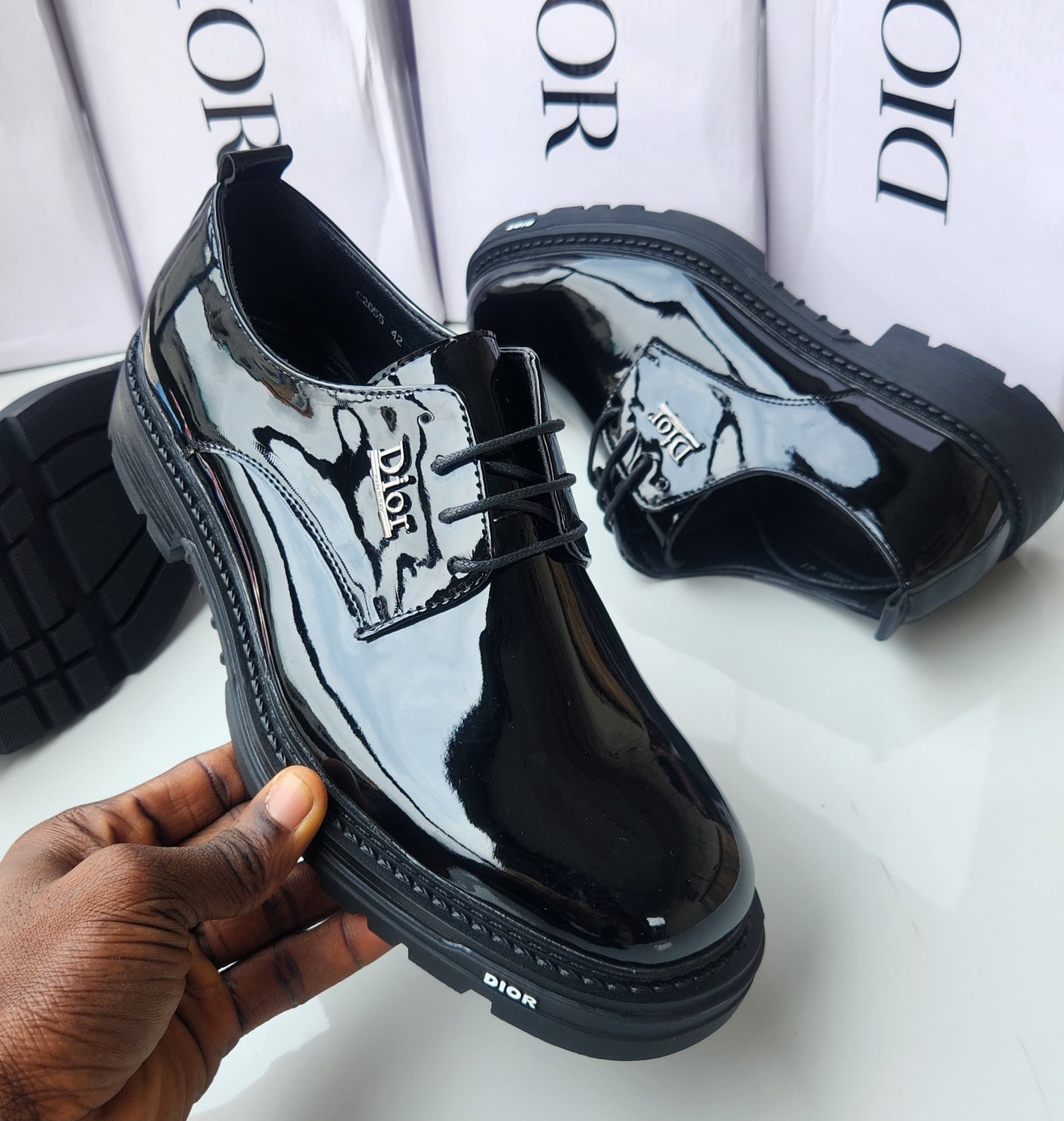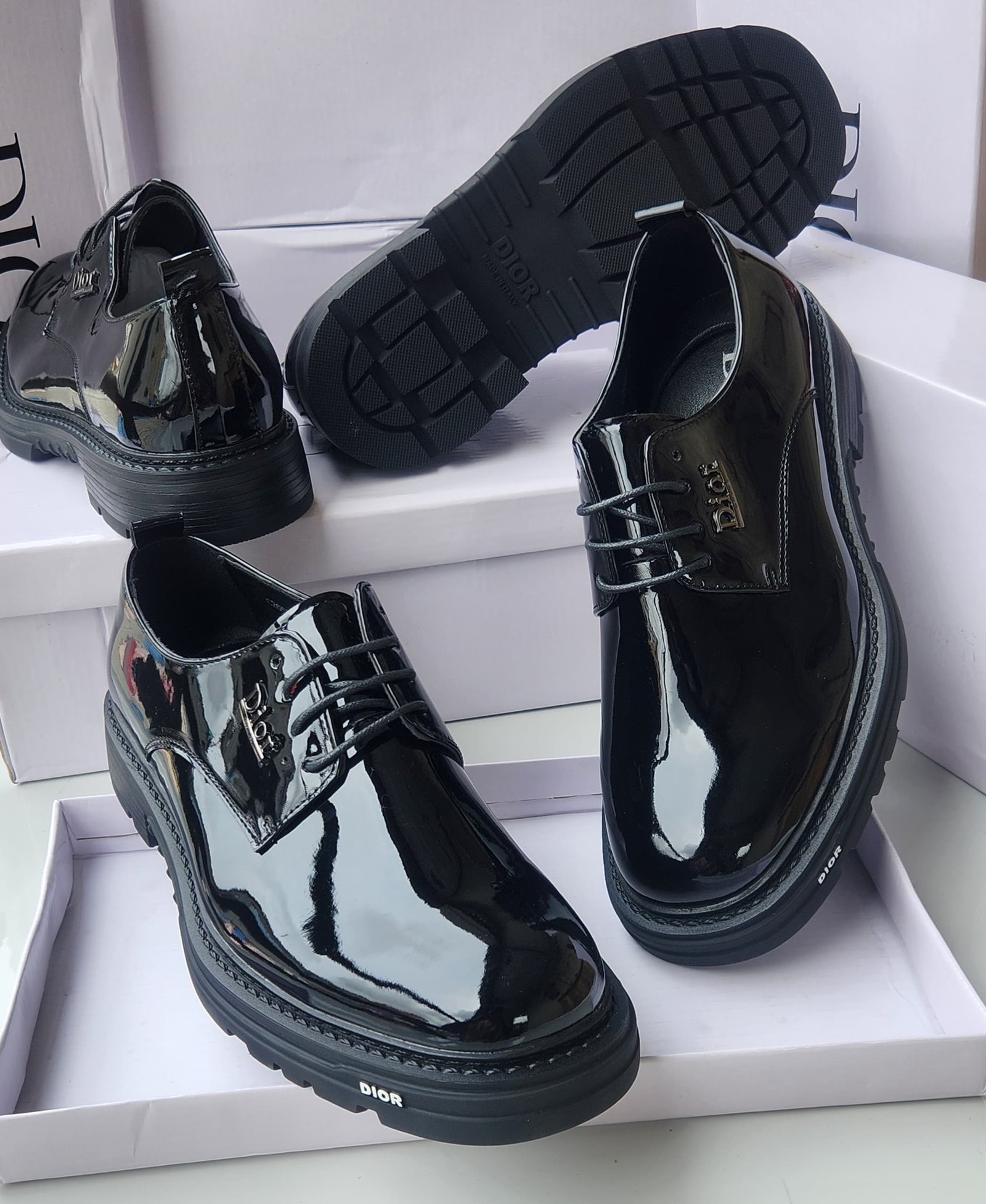 Style: Derby Shoes (an open-lacing shoe style).Material: Black Patent Leather (gives them the shiny, mirror-like finish).Sole: Chunky, Thick, or Lug Sole (the robust, ridged sole seen on the bottom of the shoe and around the edge).