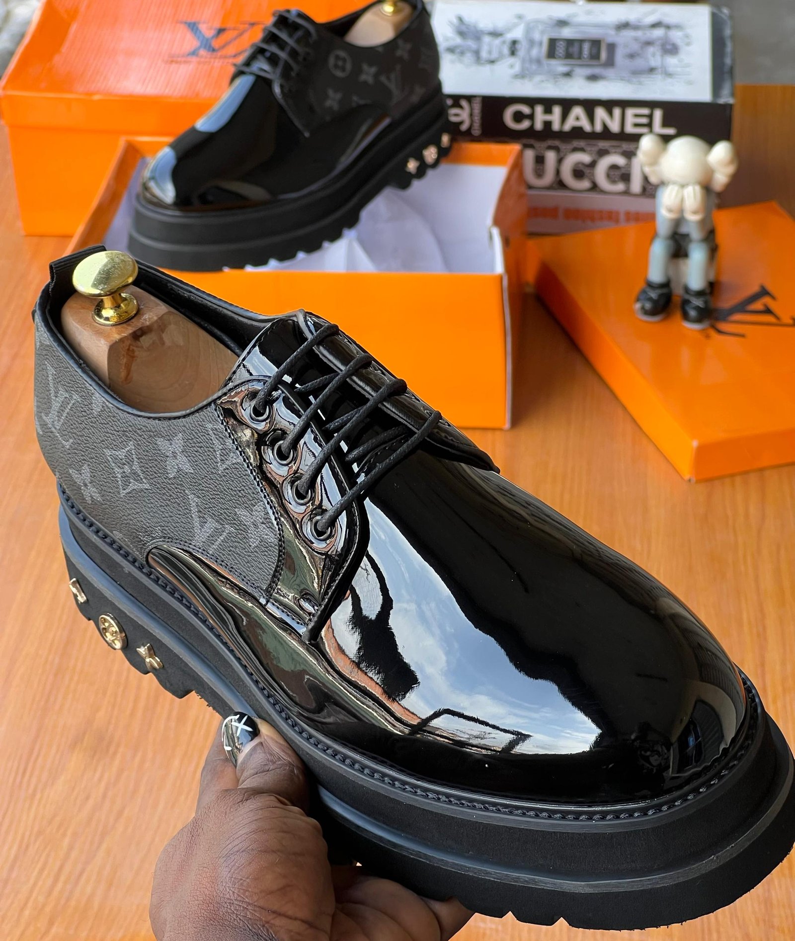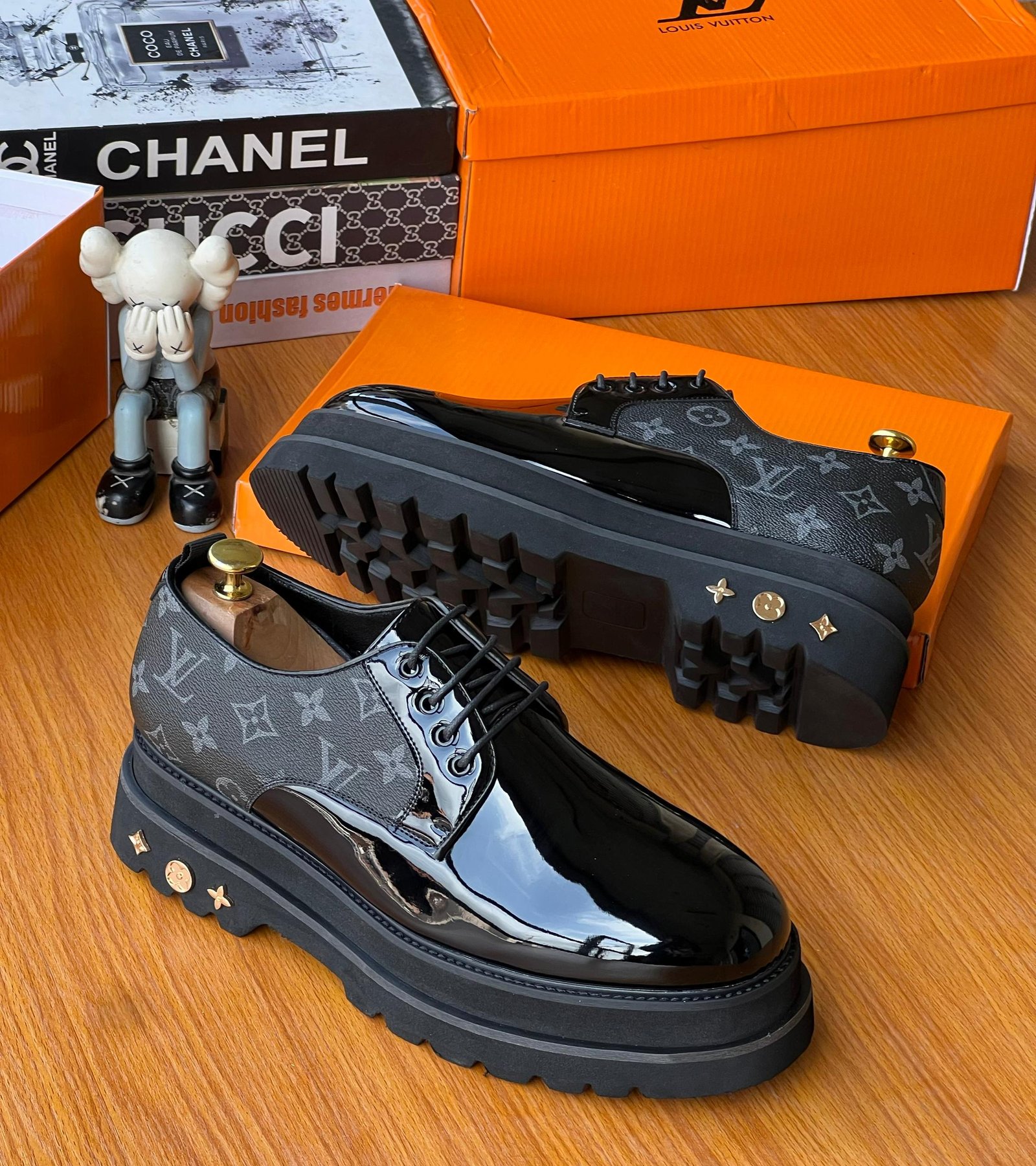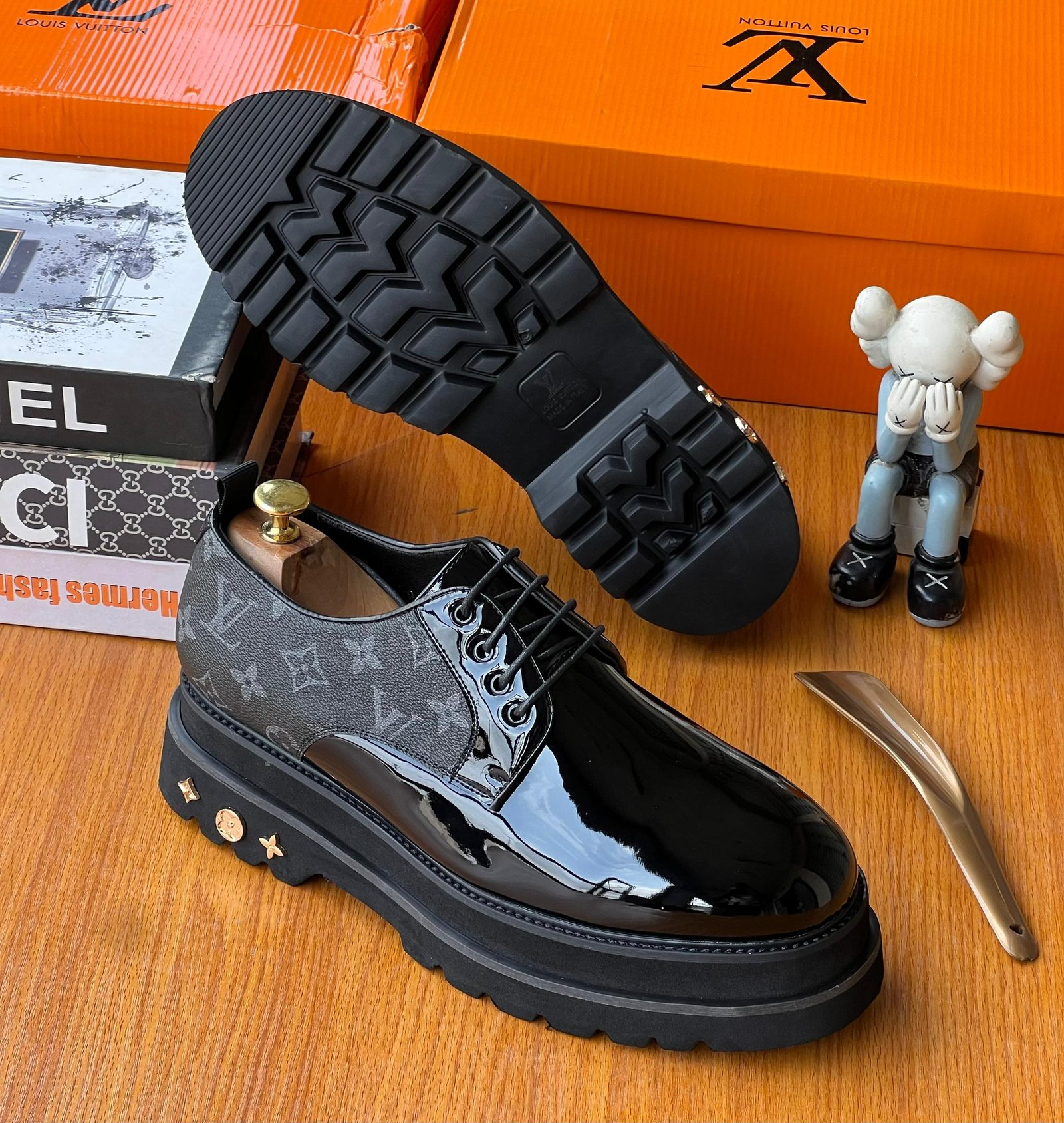 The shoes feature a glossy black patent leather toe that transitions into the iconic Louis Vuitton Monogram canvas on the quarter. The striking, exaggerated black lug sole provides a modern, utilitarian contrast, while the gold-tone LV-stamped studs on the heel add a subtle touch of luxury.