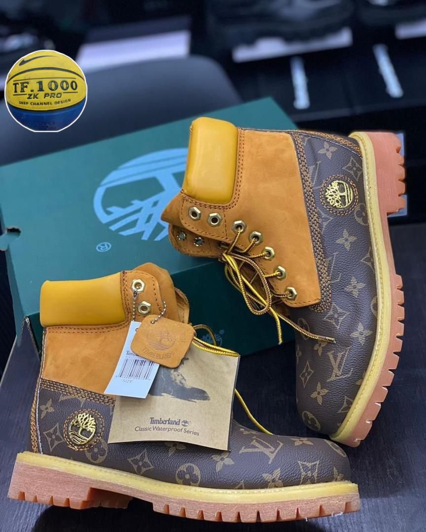Make a distinct fashion statement with the Louis Vuitton x Timberland Monogram 6-Inch Boot. This boot takes the rugged, iconic design of Timberland’s 6-Inch boot and infuses it with high-fashion aesthetics, featuring a custom Louis Vuitton-inspired monogram pattern. The classic tan nubuck leather upper is beautifully contrasted with the dark brown monogram print, creating a look that is both luxurious and street-ready. With all the features you expect from a Timberland boot—including the durable sole, padded collar, and secure lacing system—this boot offers a blend of style and function. Perfect for those who want to stand out from the crowd and add a touch of luxury to their casual or streetwear outfits.
