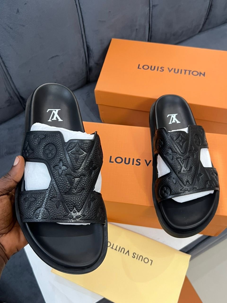 Style: Casual, flat slide sandal.Features: Wide crossover straps crafted from black leather that is heavily embossed with the Louis Vuitton Monogram pattern. The sandal features a simple, flat black rubber sole and a clean footbed.Aesthetic: Subtly luxurious and easy to wear.Packaging: Louis Vuitton orange box and yellow dust bag.
