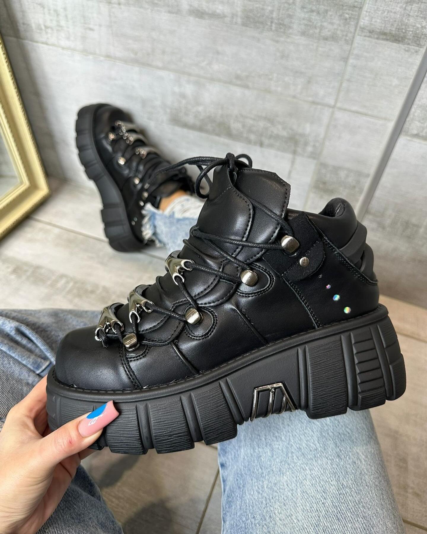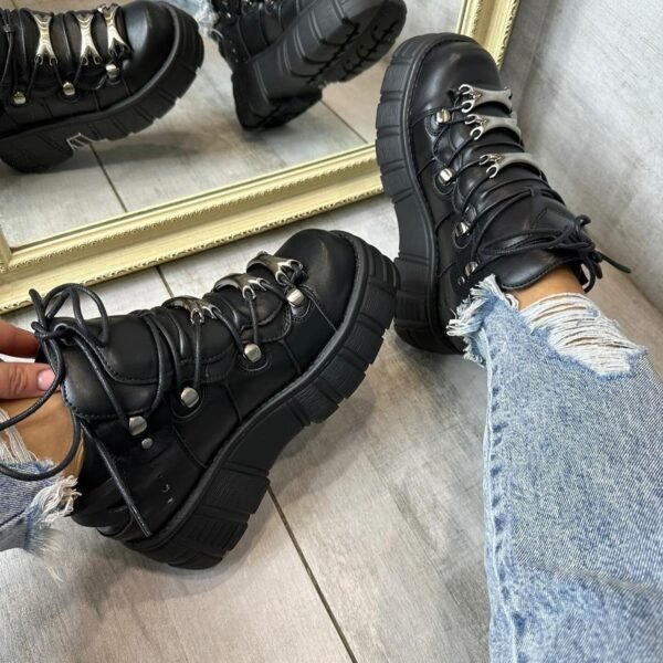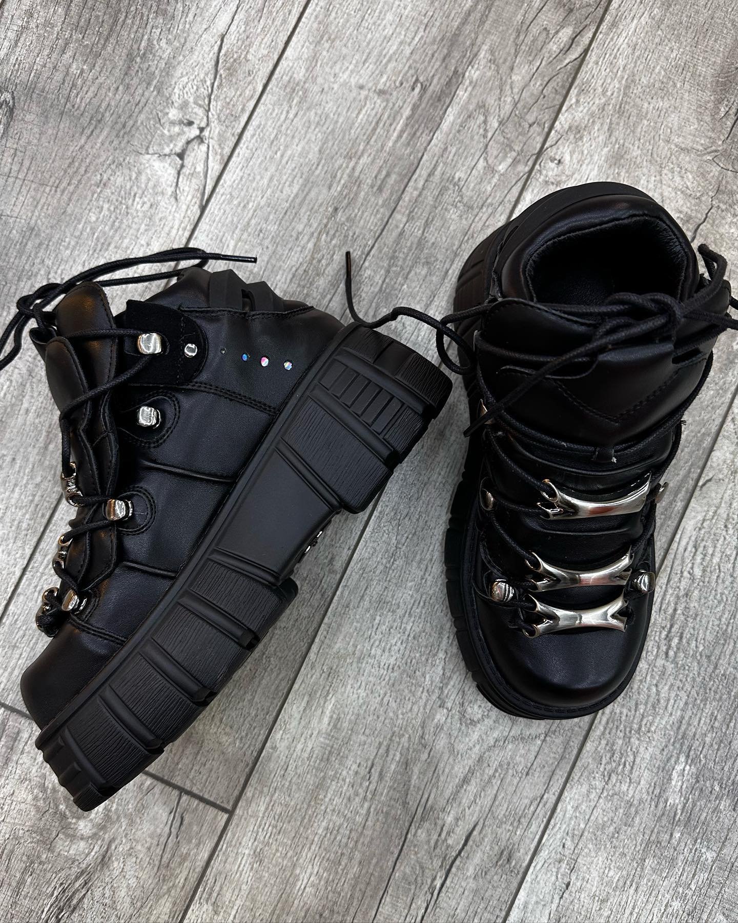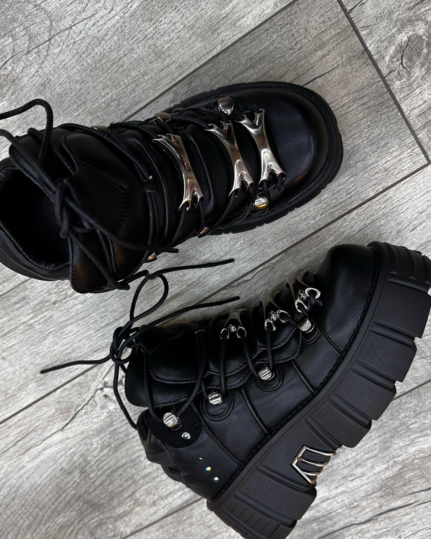 Step into a world of rebellious style with the legendary New Rock Metallic Platform Boots. Crafted with high-quality, genuine black leather, these boots are an unmistakable symbol of alternative fashion. The design is centered on the signature chunky platform sole, which is heavily accented with metallic silver-toned hardware, giving them a futuristic, industrial-goth edge. A full lace-up front ensures a snug and adjustable fit, while the sturdy construction provides durability and support.