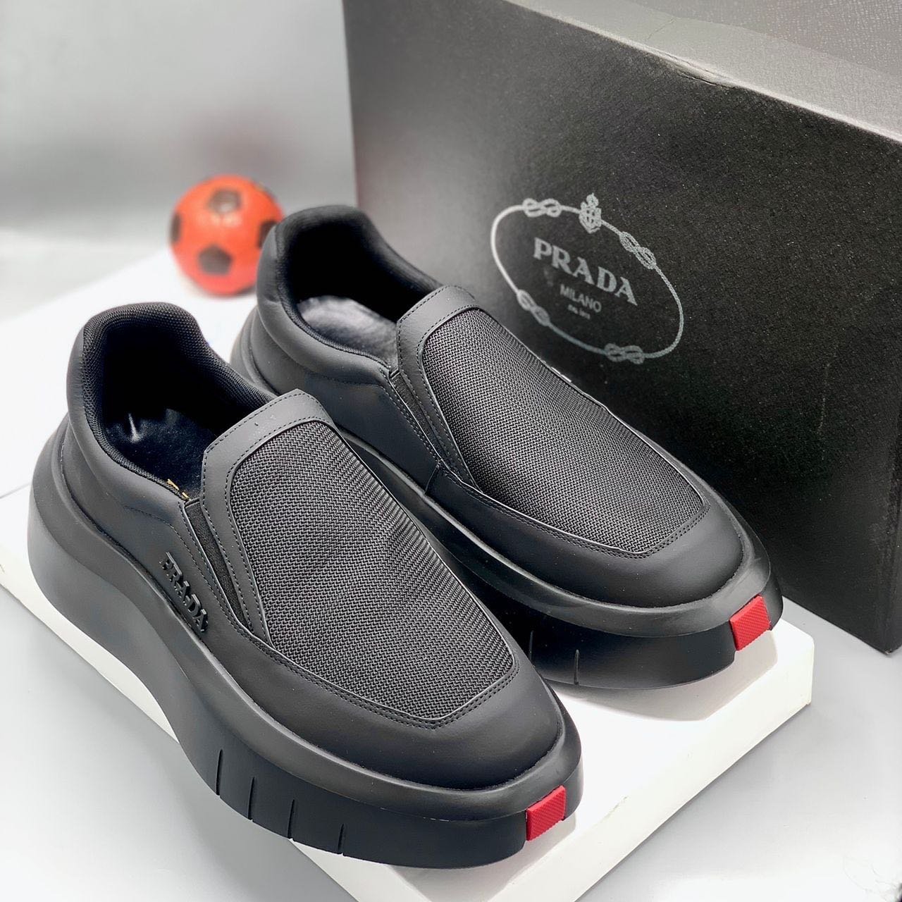 The shoe’s most striking feature is the dramatic, segmented sole with a vibrant red stripe that provides a sharp, energetic contrast to the all-black design. The “PRADA” logo is prominently displayed on the heel and bottom of the sole, cementing its luxury status. These loafers offer a powerful, contemporary silhouette that is both comfortable and a statement piece.