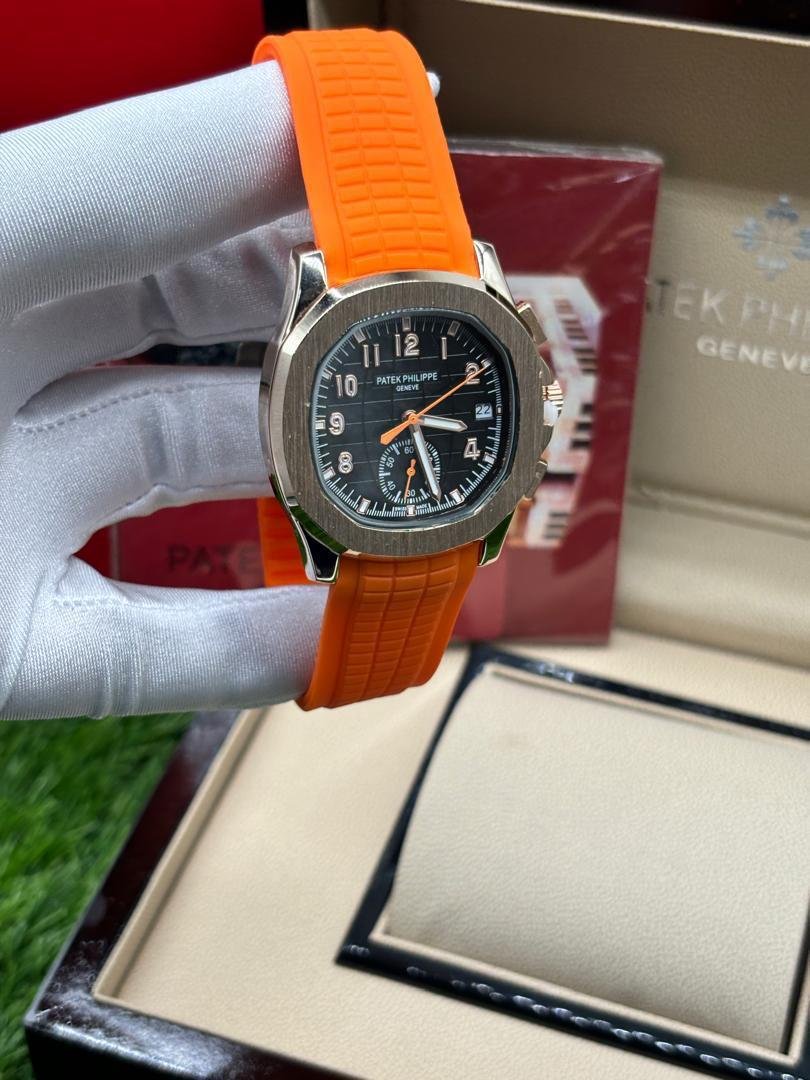 Hands and Numerals: Applied Arabic numerals and baton-style hands, all with a luminescent coating, and a contrasting orange central seconds hand.