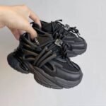 Command attention with every step in these high-fashion, statement sneakers. Crafted with a sleek, all-black upper, the design is elevated by an avant-garde cage-like lacing system that is both a functional feature and a bold visual element. The clear toggle closure offers a modern, customized fit and a unique touch of transparency. The shoe is grounded by a thick, sculptural rubber sole that not only provides exceptional comfort and support but also adds an architectural, futuristic silhouette. Perfect for those who seek to blend high-fashion aesthetics with urban functionality, these sneakers are a true expression of contemporary style.