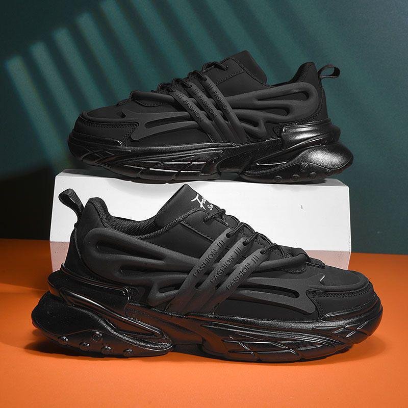 Make a bold statement with these all-black sneakers, designed for those who appreciate a blend of futuristic style and practical comfort. The monochromatic black upper is a sleek canvas for the intricate design, featuring prominent webbed lacing and a unique clear, crystal-like eyelet that adds a touch of avant-garde flair.