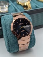 This Rado timepiece is part of the brand’s line of watches known for their use of high-tech ceramic and scratch-resistant materials. The watch features a rose gold-colored case and an integrated bracelet, giving it a seamless, contemporary look. The “Jubilé” marking on the dial indicates the use of diamonds as hour markers, adding a touch of luxury to its minimalist design.