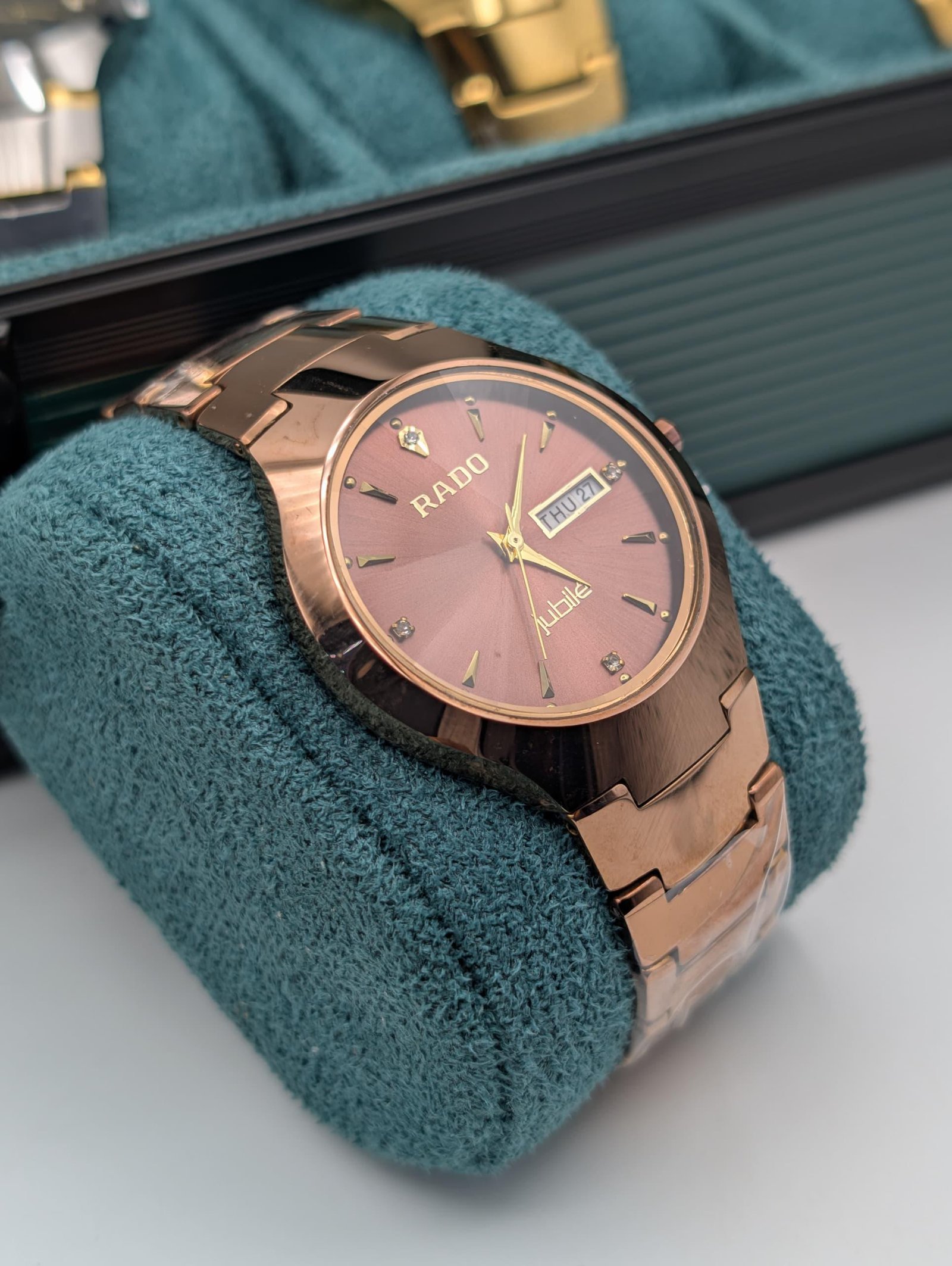 Dial: Rose gold-colored dial with a day-date window at 3 o’clock and four genuine diamonds serving as hour markers at the quarter-hour positions.