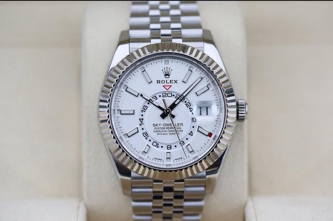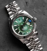 An elegant and highly functional luxury timepiece from Rolex, designed for world travelers. The Sky-Dweller is one of Rolex’s most complex watches, featuring a dual-time zone display and an annual calendar. The watch in the image appears to be a two-tone model, combining stainless steel and gold, a signature Rolex “Rolesor” combination.