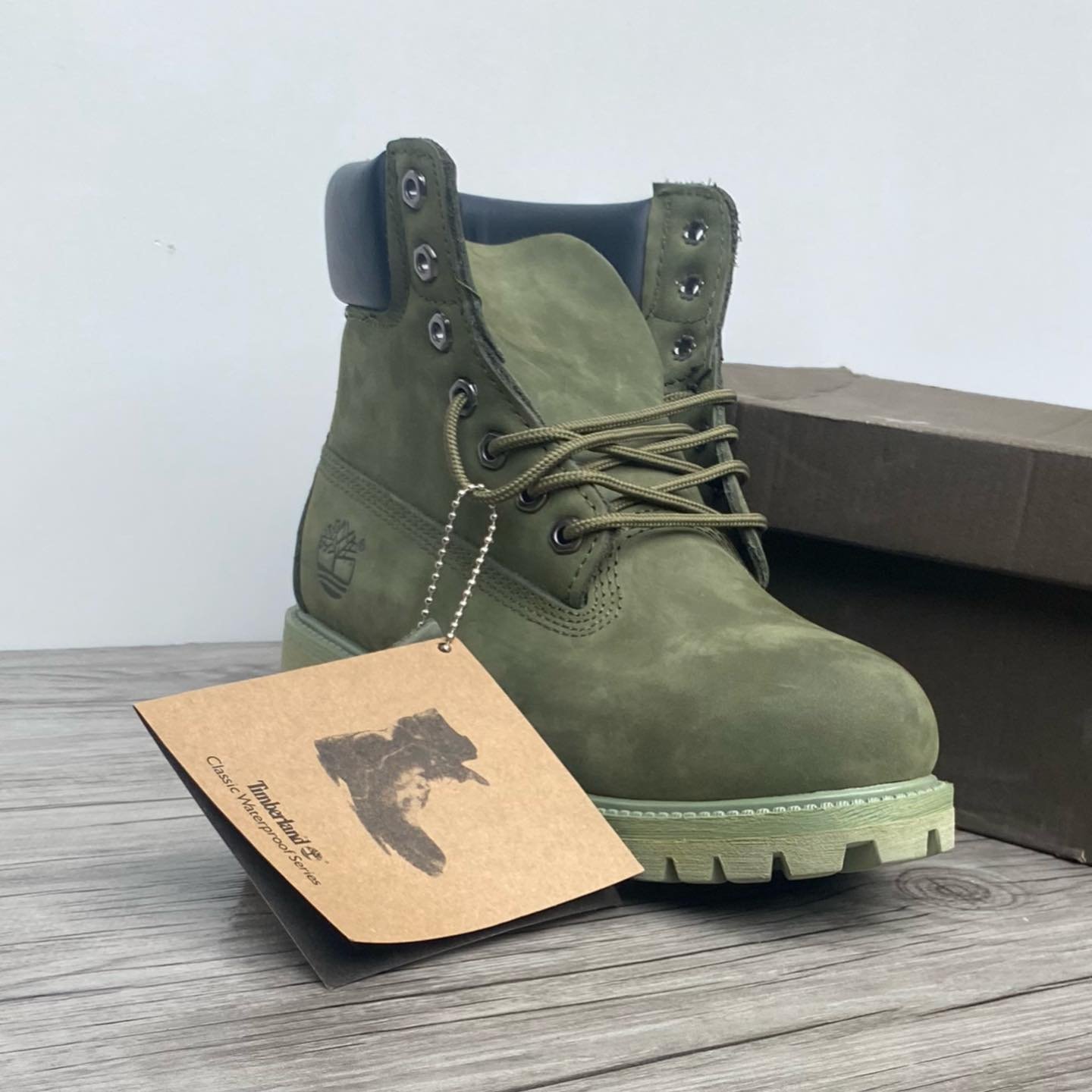 Discover the classic Timberland 6-Inch Premium Waterproof Boot in a stylish olive green. Featuring a durable nubuck leather upper, a padded collar, and a signature rubber lug sole, these boots are built for timeless style and all-weather performance.