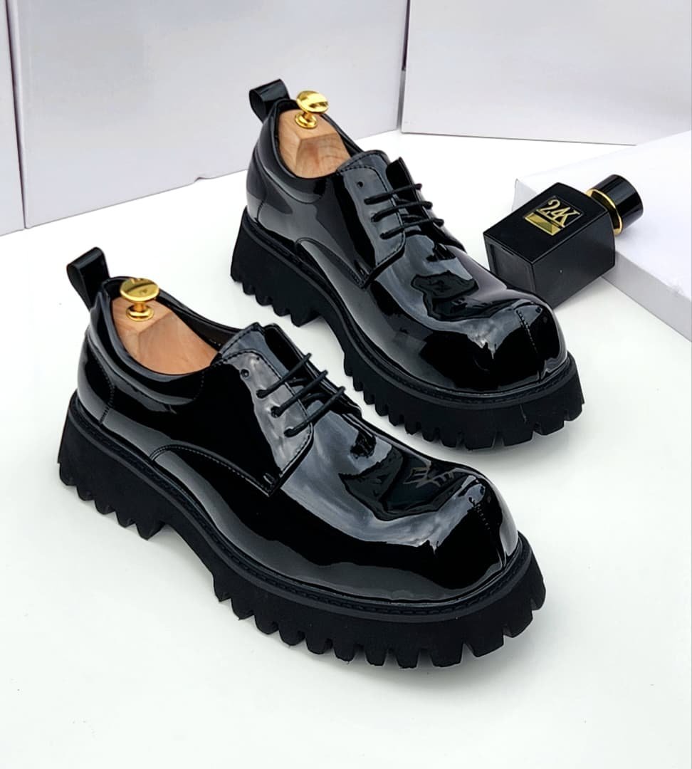 High-gloss Black Patent Leather (or calfskin), providing a mirror-like finish.Hardware: Two adjustable straps across the vamp, featuring the prominent metallic VLogo Signature hardware in silver or gold tone.Sole: Built on a chunky, notched rubber platform sole for a commanding, contemporary profile that contrasts with the formal elegance of the upper.Aesthetic: Combines refined Italian craftsmanship with a bold, structural, high-fashion street aesthetic.