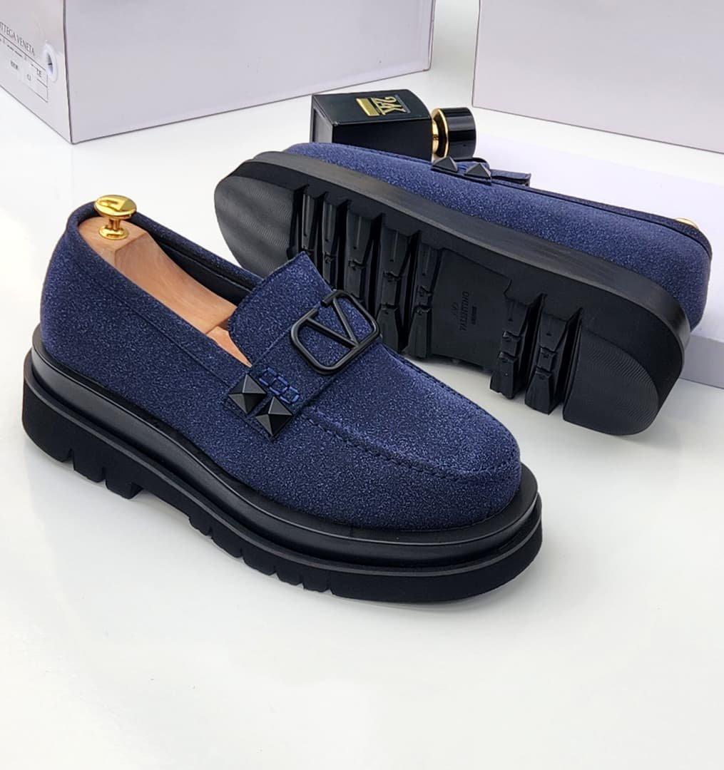 Blue Suede Loafers with a prominent Matte Black VLogo Signature hardware and a classic penny-loafer saddle strap. The look is completed by pyramid studs on the strap and a chunky lug sole.