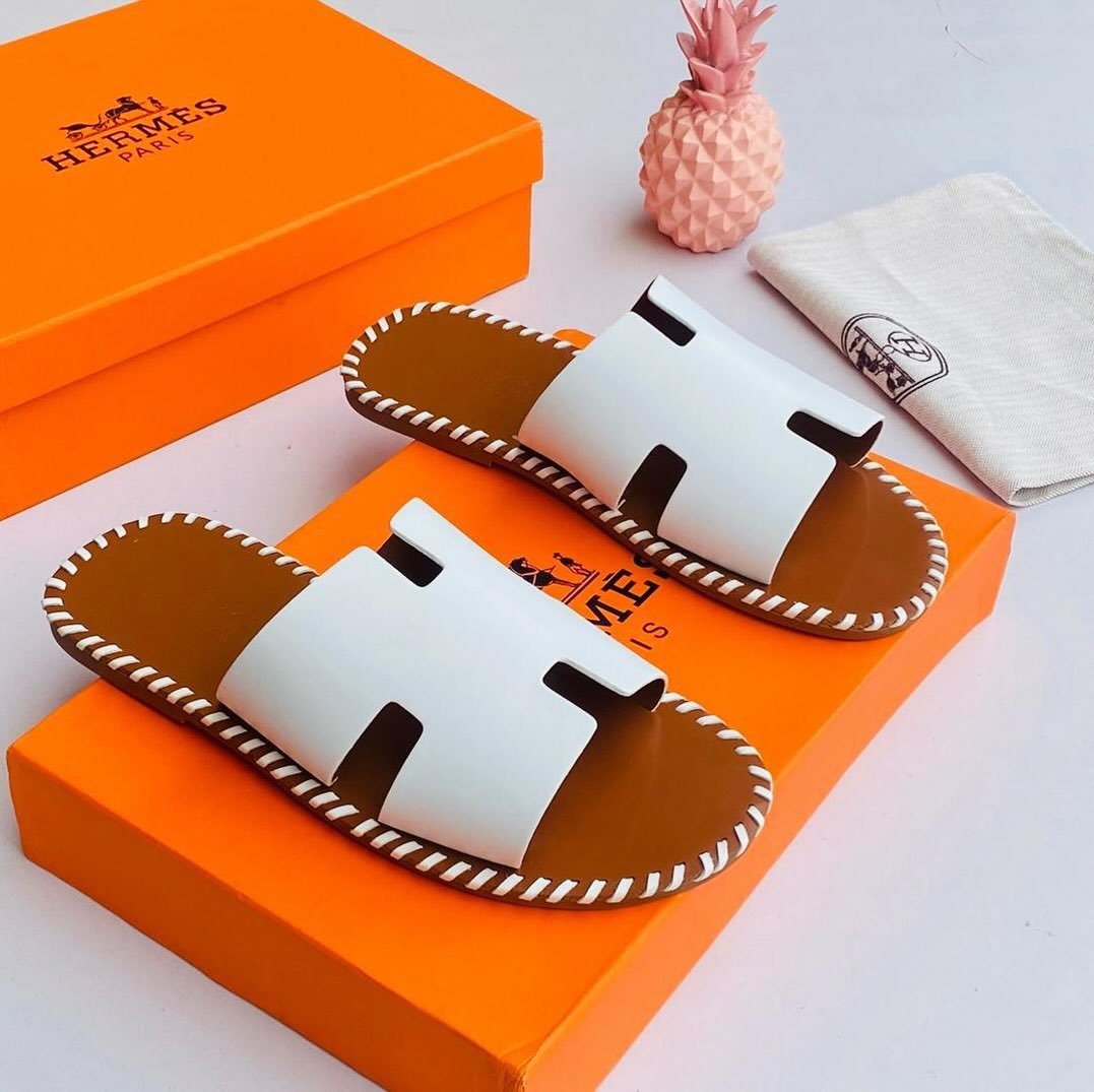 Key Highlights:Iconic Design: Features the instantly recognizable “H” strap in premium white leather, providing a clean and versatile aesthetic that complements any outfit.Artisanal Detailing: The tan footbed is framed by a striking white whipstitch border, adding a handcrafted, bohemian touch to a high-luxury profile.Premium Materials: Constructed with high-quality leather for both the upper and the footbed, ensuring the sandals age beautifully with every wear.Sophisticated Comfort: A flat, sleek profile makes these the perfect choice for everything from chic beach club lounging to urban summer strolls.Complete Luxury Package: Presented with signature orange Hermès branding and a protective dust bag, reflecting the uncompromising quality of the brand.
