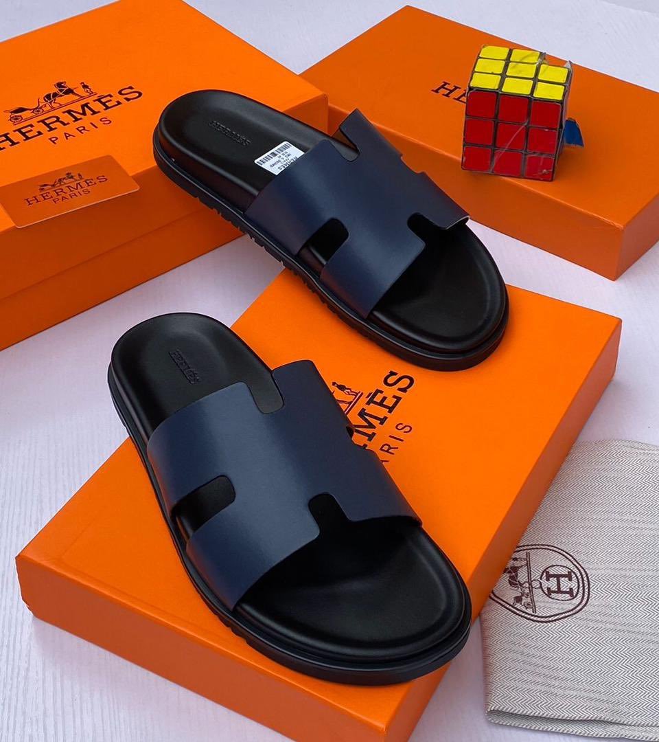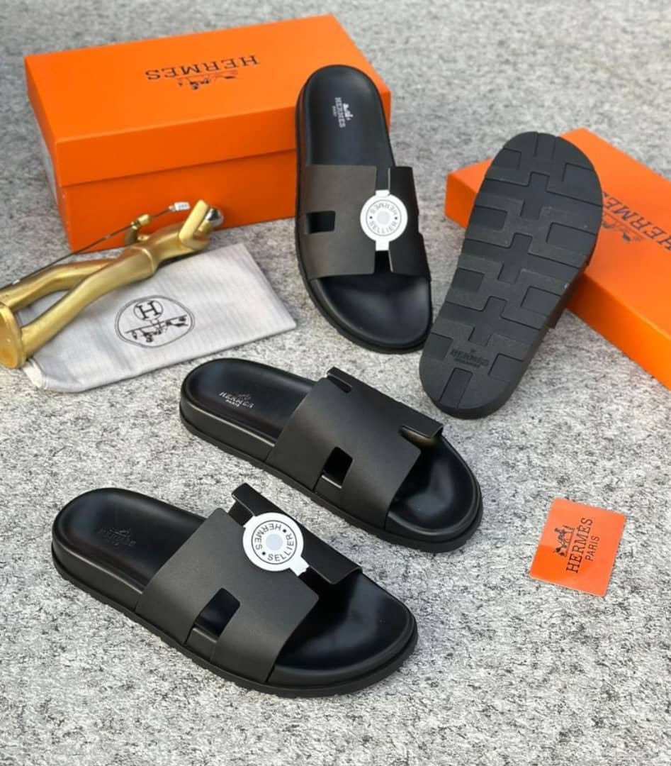 Style: Men’s flat slide sandal in a contrasting colorway.Features: Identical to the black version, but with a white calfskin leather “H” cut-out upper strap set against a black leather footbed and sole, providing a striking, modern contrast.Aesthetic: Chic, clean, and summery luxury.Packaging: Signature Hermès orange box.