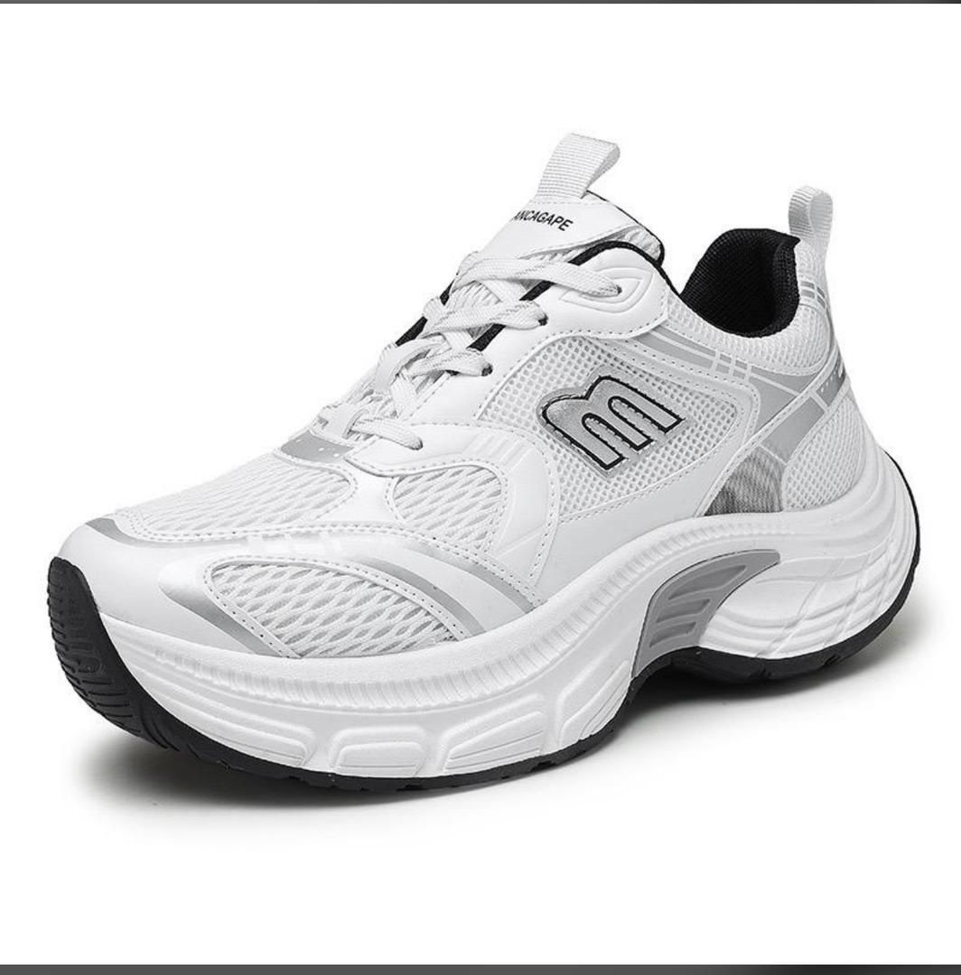 hese sneakers are designed for casual comfort, featuring a wide “M” logo on the side and a multi-paneled upper that allows for constant airflow. The extra-thick rubber sole provides significant height and shock absorption, while the padded interior ensures a soft feel for all-day walking.