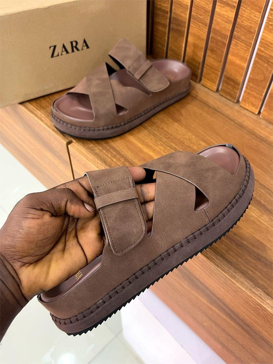 Brown suede/nubuck sandals with a thick brown sole (with Zara box in the background).